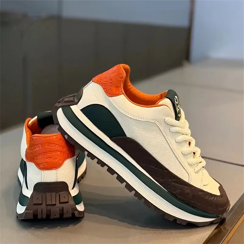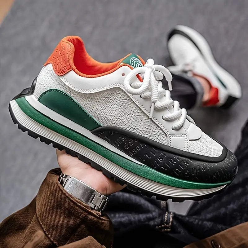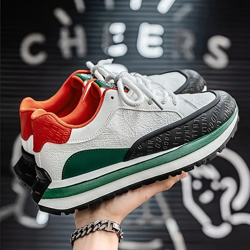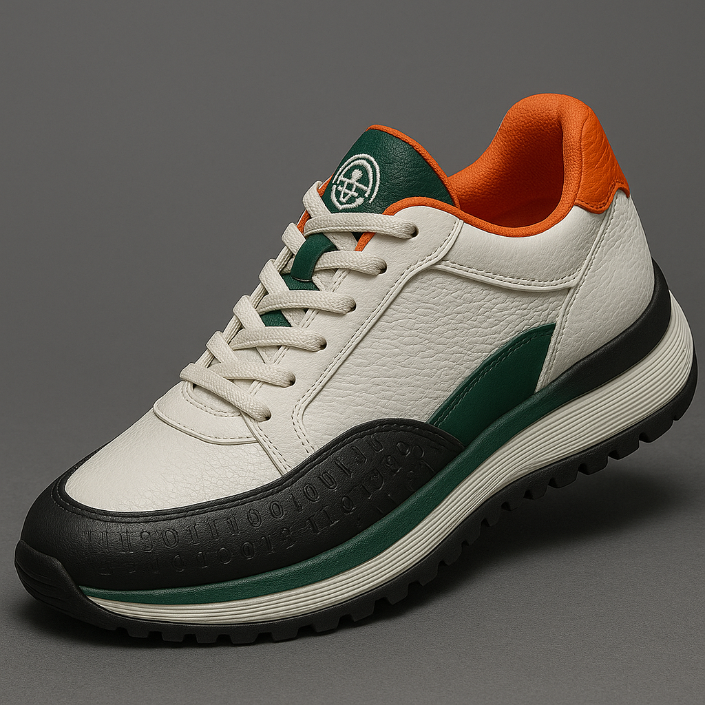 ✨ الوصف حذاء Sberdiltek VerdeX يجمع أسلوب ستريت عصري مع خامات قوية ولمسات لونية بارزة. تصميم علوي من جلد محبّب أبيض مع طوق داخلي برتقالي ولمسات خضراء داكنة، وحافة أمامية سوداء من المطاط بنقوش بارزة تمنح الحذاء طابعاً مميزاً 🌟